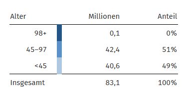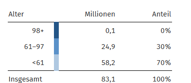 Laut den offiziellen Daten des **Statistisches Bundesamt (Destatis) zur Bevölkerung nach Altersgruppen ergibt sich für Deutschland (Stand 2026) folgende Altersstruktur der Gesamtbevölkerung: